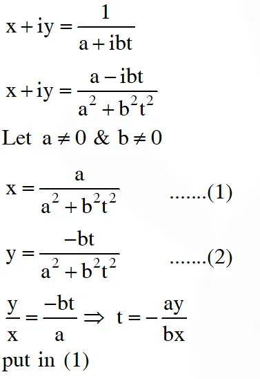Q. Let $a, b \in \square$ and $a^{2}+b^{2} \neq 0 .$ Suppose $S=\left\{z \in \square: z=\frac{1}{a+i b t}, t \in \square, t \neq 0\right\},$ where $i=\sqrt{-1}$ If $z=x+$ iy and $z \in S,$ then $(x, y)$ lies on