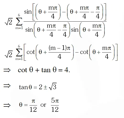 Q. For $0<\theta<\frac{\pi}{2},$ the solution(s) of $\sum_{m=1}^{6} \csc \left(\theta+\frac{(m-1) \pi}{4}\right) \csc \left(\theta+\frac{m \pi}{4}\right)=4 \sqrt{2}$ is (are)