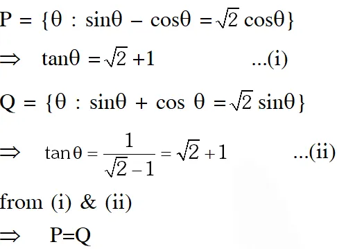 Q. Let $\mathrm{P}=\{\theta: \sin \theta-\cos \theta=\sqrt{2} \cos \theta\}$ and $\mathrm{Q}=\{\theta: \sin \theta+\cos \theta=\sqrt{2} \sin \theta\}$ be two sets. Then