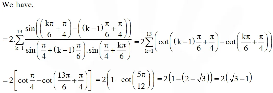 Q. The value of $\sum_{\mathrm{k}=1}^{13} \frac{1}{\sin \left(\frac{\pi}{4}+\frac{(\mathrm{k}-1) \pi}{6}\right) \sin \left(\frac{\pi}{4}+\frac{\mathrm{k} \pi}{6}\right)}$ is equal to