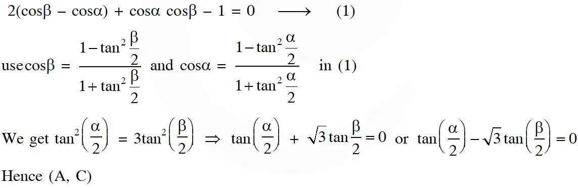 Q. Let $\alpha$ and $\beta$ be nonzero real numbers such that $2(\cos \beta-\cos \alpha)+\cos \alpha \cos \beta=1$. Then which of the following is/are true ?