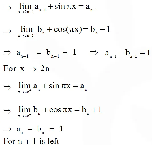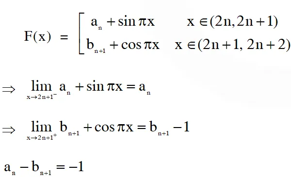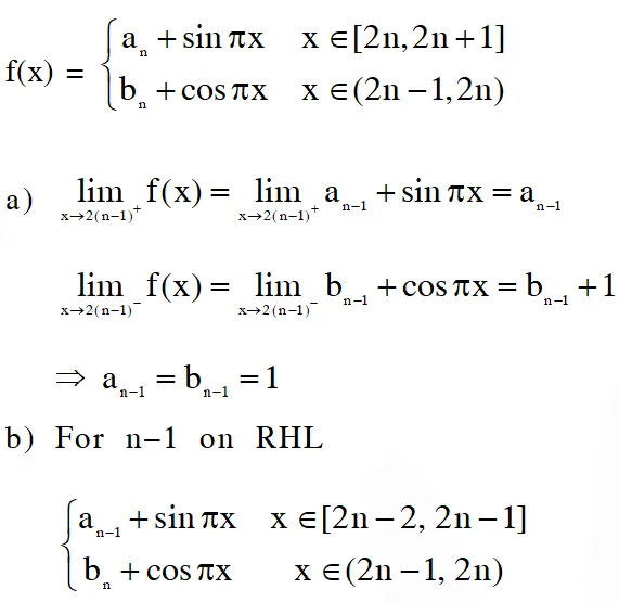 $f(\mathrm{x})=\left\{\begin{array}{ll}{\mathrm{a}_{\mathrm{n}}+\sin \pi \mathrm{x},} & {\text { for } \quad \mathrm{x} \in[2 \mathrm{n}, 2 \mathrm{n}+1]} \\ {\mathrm{b}_{\mathrm{n}}+\cos \pi \mathrm{x},} & {\text { for } \quad \mathrm{x} \in(2 \mathrm{n}-1,2 \mathrm{n})}\end{array}, \text { for all integers } \mathrm{n}\right.$