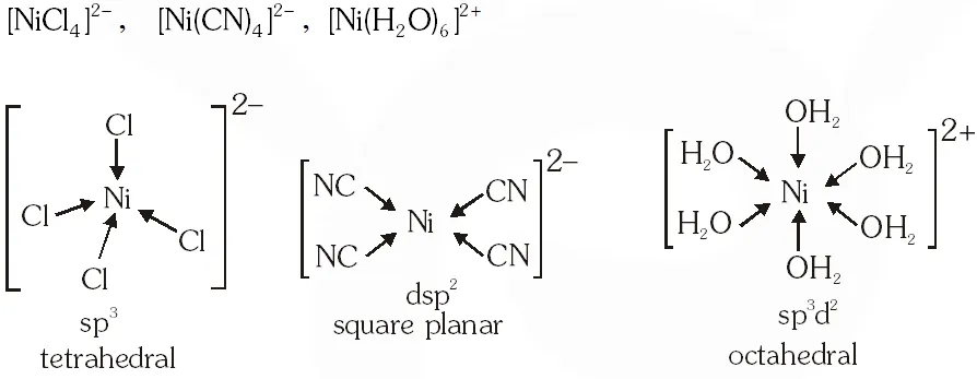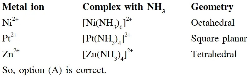 Q. The geometries of the ammonia complexes of $\mathrm{Ni}^{2+}, \mathrm{Pt}^{2+}$ and $\mathrm{Zn}^{2+}$ , respectively , are :
