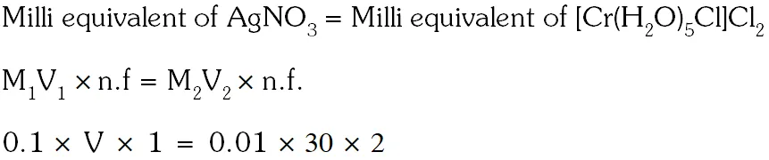 Q. The volume (in mL) of 0.1M AgNO3 required for complete precipitation of chloride ions present in 30 mL of 0.01M solution of $\left[\mathrm{Cr}\left(\mathrm{H}_{2} \mathrm{O}\right)_{6} \mathrm{Cl}\right] \mathrm{Cl}_{2}$, as silver chloride is close to.