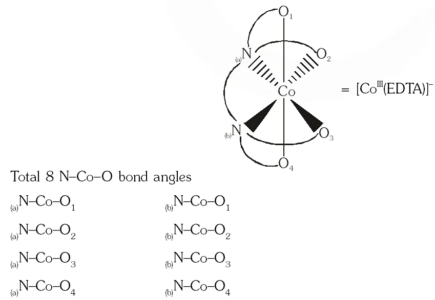 Q. EDTA $^{4}$ is ethylenediaminetetraacetate ion. The total number of $\mathrm{N}-\mathrm{Co}-\mathrm{O}$ bond angles in $[\mathrm{Co}(\mathrm{EDTA})]^{-1}$ complex ion is -
