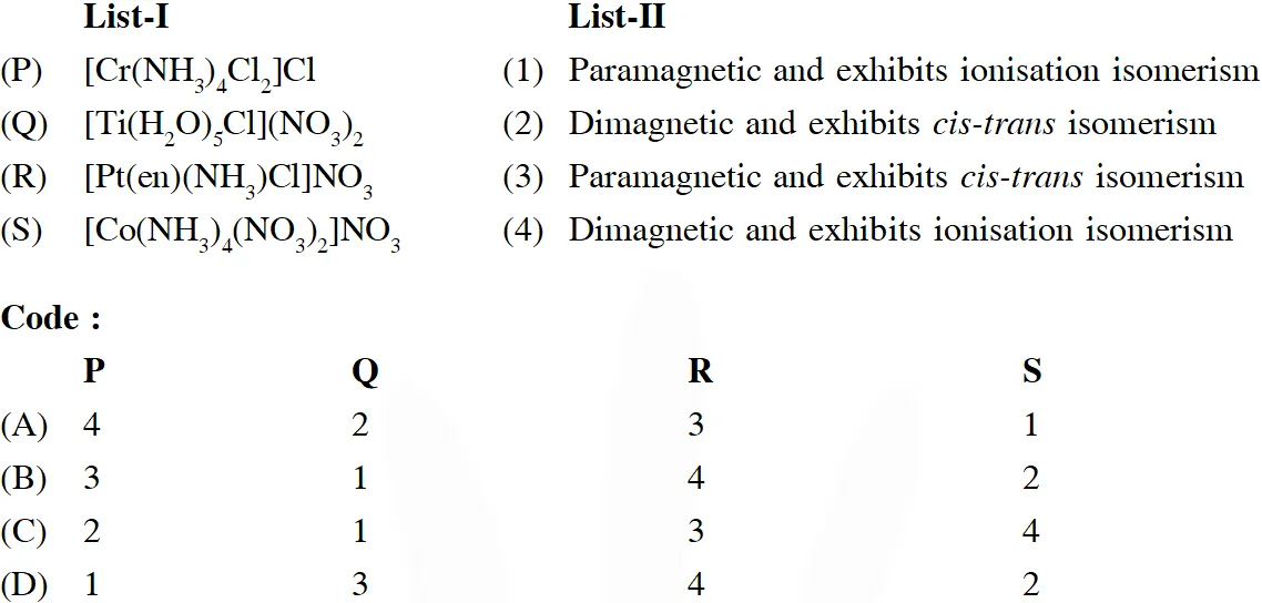Q. Match each coordination compound in List-I with an appropriate pair of characteristics from List-II and select the correct answer using the code given below the lists.