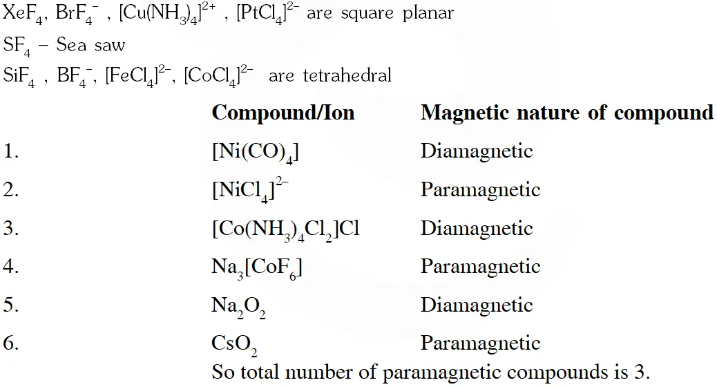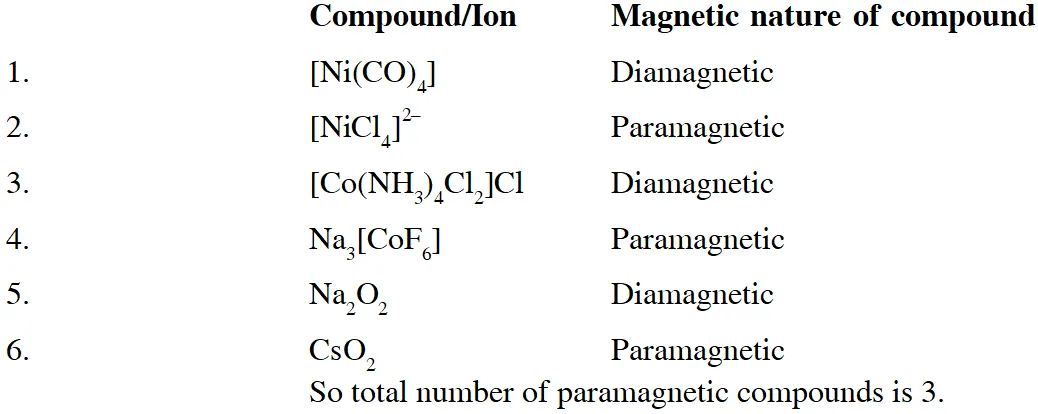 Q. Among $\left[\mathrm{Ni}(\mathrm{CO}), \mathrm{I},\left[\mathrm{NiCl}_{4}\right]^{2},\left[\mathrm{Co}\left(\mathrm{NH}_{3}\right), \mathrm{Cl}_{2}\right] \mathrm{Cl}, \mathrm{Na}_{3}\left[\mathrm{CoF}_{6}\right], \mathrm{NaO}_{2} \mathrm{and} \mathrm{Co}_{2}\right.$, the total number of paramagnetic compounds is –