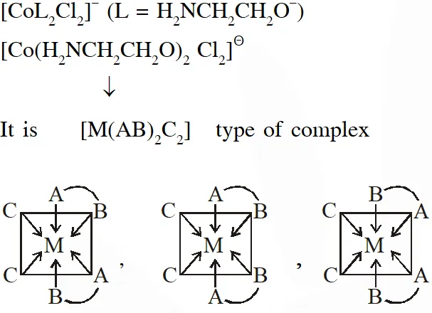 Q. The number of geometric isomers possible for the complex$\left[\mathrm{CoL}_{2} \mathrm{Cl}_{2}\right]^{-}\left(\mathrm{L}=\mathrm{H}_{2} \mathrm{NCH}_{2} \mathrm{CH}_{2} \mathrm{O}^{-}\right)$ is