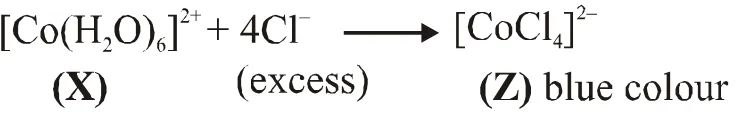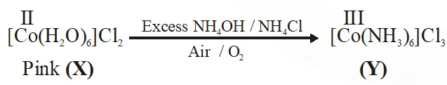 Q. Addition of excess aqueous ammonia to a pink coloured aqueous solution of $\mathrm{MCl}_{2} \cdot 6 \mathrm{H}_{2} \mathrm{O}$ (X) and $\mathrm{NH}_{4} \mathrm{Cl}$ gives an octahedral complex Y in the presence of air. In aqueous solution, complex Y behaves as 1 : 3 electrolyte. The reaction of X with excess HCl at room temperature results in the formation of a blue coloured complex Z. The calculated spin only magnetic moment of X and Z is 3.87 B.M., whereas it is zero for complex Y.
