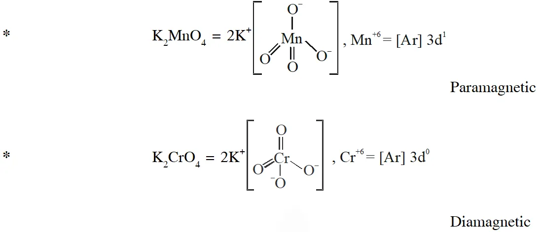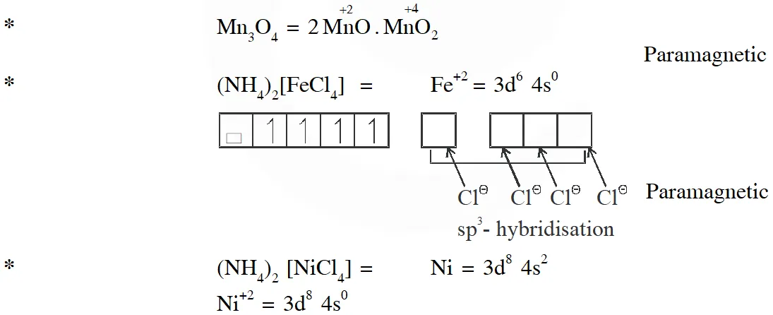 $\mathrm{Mn}_{3} \mathrm{O}_{4},\left(\mathrm{NH}_{4}\right)_{2}\left[\mathrm{FeCl}_{4}\right],\left(\mathrm{NH}_{4}\right)_{2}\left[\mathrm{NiCl}_{4}\right], \mathrm{K}_{2} \mathrm{MnO}_{4}, \mathrm{K}_{2} \mathrm{CrO}_{4}$