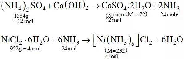 Q. The ammonia prepared by treating ammonium sulphate with calcium hydroxide is completely used by $\mathrm{NiCl}_{2} \cdot 6 \mathrm{H}_{2} \mathrm{O}$ to form a stable coordination compound. Assume that both the reactions are 100% complete. If 1584 g of ammonium sulphate and 952g of NiCl2.6H2O are used in the preparation, the combined weight (in grams) of gypsum and the nickel-ammonia coordination compound thus produced is___.