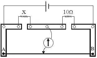 Q. A meter bridge is set-up as shown, to determine an unknown resistance ‘X’ using a standard 10 ohm resistor. The galvanometer shows point when tapping-key is at 52 cm mark. The end-corrections are 1 cm and 2 cm respectively for the ends A and B. The determined value of ‘X’ is-