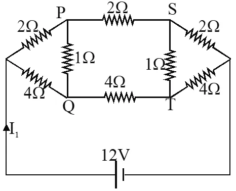 (A) the current through PQ is zero (B) $\mathrm{I}_{1}=3 \mathrm{A}$ (C) The potential at S is less than that at Q (D) $\mathrm{I}_{2}=2 \mathrm{A}$