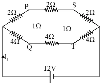 $I_{2}=\frac{12}{6}=2 A$, $I_{1}=\frac{12}{6}+\frac{12}{12}=3 A$ and Potential of $\mathrm{S}$ is less than that at $\mathrm{Q}$