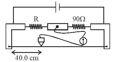 Q. During an experiment with a metre bridge, the galvanometer shows a point when the jockey is pressed at 40.0 cm using a standard resistance of $90 \Omega$, as shown in the figure. The least count of the scale used in the metre bridge is 1mm. The unknown resistance is :-