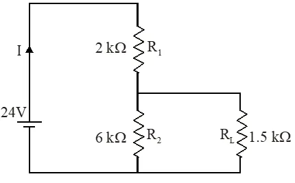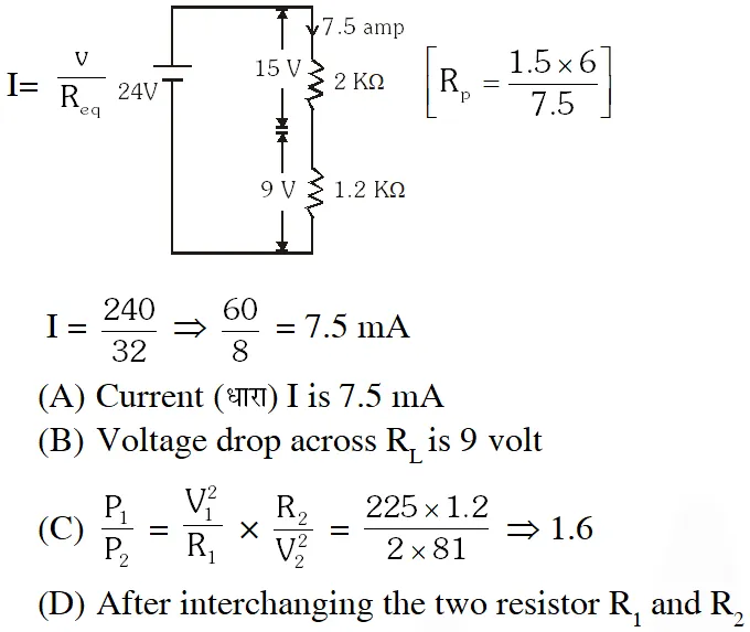 Q.For the circuit shown in the figure - (A) the current I through the battery is 7.5 mA (B) the potential difference across $\mathrm{R}_{\mathrm{L}}$ is 18V (C) ratio of powers dissipated in $\mathrm{R}_{1}$ and $\mathrm{R}_{2}$ is 3 (D) if $\mathrm{R}_{1}$ and $\mathrm{R}_{2}$ are interchanged, magnitude of the power dissipated in $\mathrm{R}_{\mathrm{L}}$ will decrease by a factor of 9