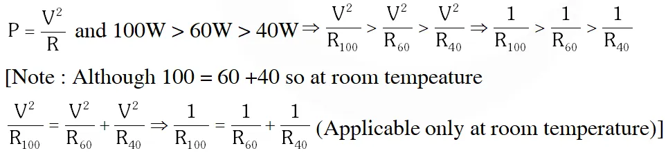 [IIT-JEE 2009] Q. Incandescent bulbs are designed by keeping in mind that the resistance of their filament increases with the increase in temperature. If at room temperature, 100 W, 60 W and 40 W bulbs have filament resistance $\mathrm{R}_{100} \cdot \mathrm{R}_{60} \mathrm{and} \mathrm{R}_{40}$, respectively, the relation between these resistances is – $(\mathrm{A}) \frac{1}{\mathrm{R}_{100}}=\frac{1}{\mathrm{R}_{40}}+\frac{1}{\mathrm{R}_{60}}$ $(\mathrm{B}) \mathrm{R}_{100}=\mathrm{R}_{40}+\mathrm{R}_{60}$ (C) $\mathrm{R}_{100}>\mathrm{R}_{60}>\mathrm{R}_{40}$ $(\mathrm{D}) \frac{1}{\mathrm{R}_{100}}>\frac{1}{\mathrm{R}_{60}}>\frac{1}{\mathrm{R}_{40}}$ [IIT-JEE 2010]