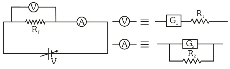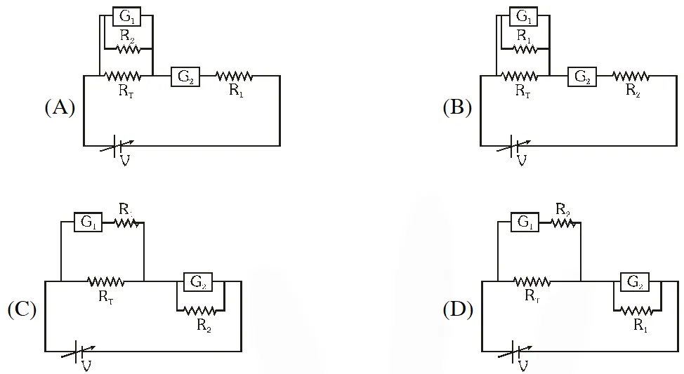 Q. To verify Ohm’s law, a student is provided with a test resistor $\mathrm{R}_{\mathrm{T}}$, a high resistance $R_{1}$, a small resistance $\mathrm{R}_{2}$, two identical galvanometers $\mathrm{G}_{1}$ and $\mathrm{G}_{2}$, and a variable voltage source V. The correct circuit to carry out the experiment is :–