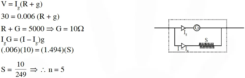 Q. A galvanometer gives full scale deflection with 0.006 A current. By connecting it to a $4990 \Omega$ resistance, it can be converted into a voltmeter of range 0 - 30 V. If connected to a $\frac{2 \mathrm{n}}{249} \Omega$ resistance, it becomes an ammeter of range 0 - 1.5 A. The value of n is :- [JEE Advanced 2014]