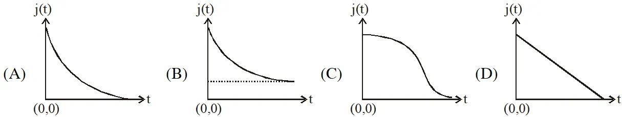 Q. An infinite line charge of uniform electric charge density $\lambda$ lies along the axis of an electrically conducting infinite cylindrical shell of radius R. At time t = 0, the space inside the cylinder is filled with a material of permittivity $\varepsilon$ and electrical conductivity $\sigma$. The electrical conduction in the material follows Ohm's law. Which one of the following graphs best describes the subsequent variation of the magnitude of current density j(t) at any point in the material?