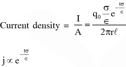 [JEE Advanced 2016] Ans. (A) This is the problem of RC circuit where the product RC is a constant. So due to leakage current, charge & current density will exponentially decay & will become zero at infinite time. So correct answer is (A) for any small element Resistance $\mathrm{R}=\frac{\mathrm{dr}}{\sigma(2 \pi r \ell)}$ Capacitance $\mathrm{C}=\frac{\in 2 \pi \mathrm{r} \ell}{\mathrm{dr}}$ Product $\mathrm{R} \times \mathrm{C}=\frac{\epsilon}{\sigma}=\mathrm{constant}$ $\mathrm{q}=\mathrm{q}_{0} \mathrm{e}^{-\left(\frac{\mathrm{t} \sigma}{\epsilon}\right)}$ $\mathrm{I}=\frac{\mathrm{d} q}{\mathrm{dt}}=\frac{\mathrm{q}_{0} \sigma}{\epsilon} \mathrm{e}^{-\left(\frac{\mathrm{t} \sigma}{\epsilon}\right)}$