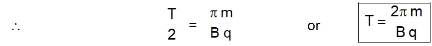 Under the action of the given magnetic field (B fixed), the given positive ion (e/m fixed) will cover the semi-circular path in a fixed time only, if t in equation is equal to $\frac{T}{2}$ Where T is the time period of the electric field.