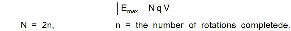 Maximum energy acquired by positive ions depends on the radius R of the dees. After acquire this energy positive ion emerge out the dees and use for hitting the target. Let $\mathrm{V}_{\mathrm{max}}$ be the velocity acquired by the positive ions, when it moves along the largest circular path i.e. path of radius equal to the radius R of the dees. Then $\mathrm{B} \mathrm{q} \mathrm{v}_{\max }=\frac{\mathrm{m} \mathrm{v}_{\max }^{2}}{\mathrm{R}}$ OR $v_{\max }=\frac{B q R}{m}$ Therefore maximum kinetic energy gained by the positive ion, $$ E_{\max }=\frac{1}{2} m v_{\max }^{2}=\frac{1}{2} m\left(\frac{B q R}{m}\right)^{2} $$ OR $E_{\max }=\frac{1}{2} \frac{B^{2} q^{2} R^{2}}{m}$ The maximum energy acquired by the positive ion can be expressed in another form as given below : If V is the potential difference applied between the dees and N is the number of times, the positive ion cross the gap between the dees before leaving the dees, then $E_{\max }=N q V$ $N=2 n$ $n=$ the number of rotations completede.