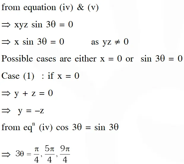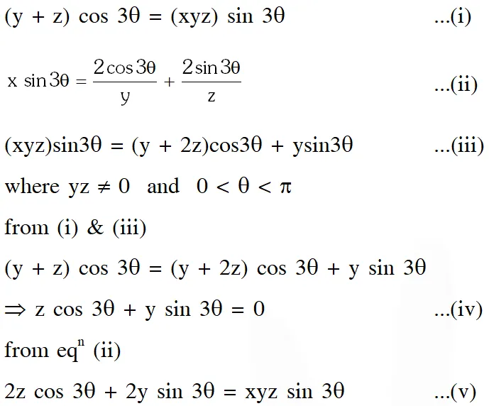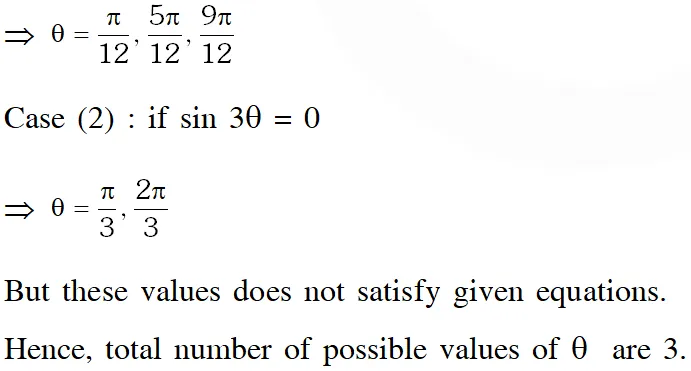 Q. The number of all possible values of $\theta,$ where $0<\theta<\pi,$ for which the system of equations $(\mathrm{y}+\mathrm{z}) \cos 3 \theta=(\mathrm{xyz}) \sin 3 \theta \mathrm{x} \sin 3 \theta=\frac{2 \cos 3 \theta}{\mathrm{y}}+\frac{2 \sin 3 \theta}{\mathrm{z}}(\mathrm{xyz}) \sin 3 \theta=(\mathrm{y}+2 \mathrm{z}) \cos 3 \theta+\mathrm{ysin} 3 \theta$ have a solution $\left(\mathrm{x}_{0}, \mathrm{y}_{0}, \mathrm{z}_{0}\right)$ with $\mathrm{y}_{0} \mathrm{z}_{0} \neq 0,$ is