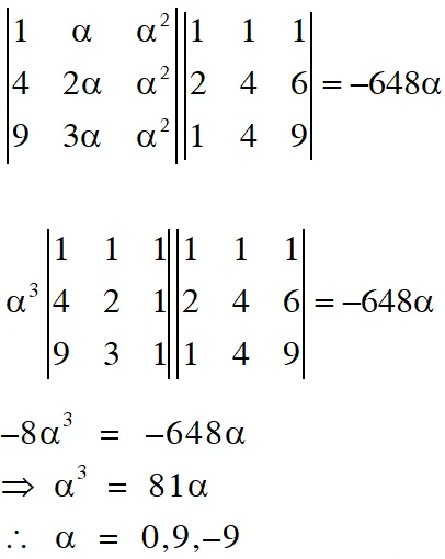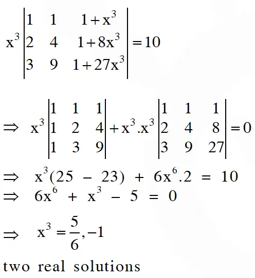 Q. The total number of distinct $\mathrm{x} \in \mathrm{R}$ for which $\left|\begin{array}{ccc}{\mathrm{x}} & {\mathrm{x}^{2}} & {1+\mathrm{x}^{3}} \\ {2 \mathrm{x}} & {4 \mathrm{x}^{2}} & {1+8 \mathrm{x}^{3}} \\ {3 \mathrm{x}} & {9 \mathrm{x}^{2}} & {1+27 \mathrm{x}^{3}}\end{array}\right|=10$ is