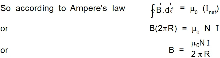 So, $\quad \quad \oint \overrightarrow{\mathrm{B}} \cdot \overrightarrow{\mathrm{d}} \vec{\ell}=\mathrm{B} \ell=\mathrm{B}(2 \pi \mathrm{R})$