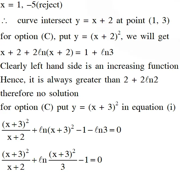 Q. A solution curve of the differential equation $\left(\mathrm{x}^{2}+\mathrm{xy}+4 \mathrm{x}+2 \mathrm{y}+4\right) \frac{\mathrm{dy}}{\mathrm{dx}}-\mathrm{y}^{2}=0, \mathrm{x}>0$ passes through the point $(1,3) .$ The the solution curve-