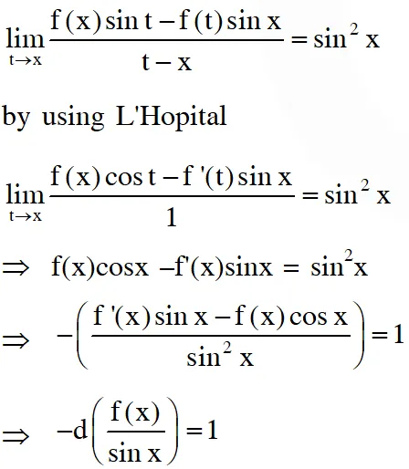 Q. Let $f:(0, \pi) \rightarrow \square$ be a twice differentiable function such that $\lim _{t \rightarrow \pi} \frac{f(x) \sin t-f(t) \sin x}{t-x}=\sin ^{2} x$ for all $\mathrm{x} \in(0, \pi) .$ If $f\left(\frac{\pi}{6}\right)=-\frac{\pi}{12},$ then which of the following statement(s) is (are) TRUE?