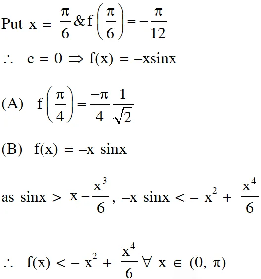 (B) $f(\mathrm{x})<\frac{\mathrm{x}^{4}}{6}-\mathrm{x}^{2}$ for all $\mathrm{x} \in(0, \pi)$