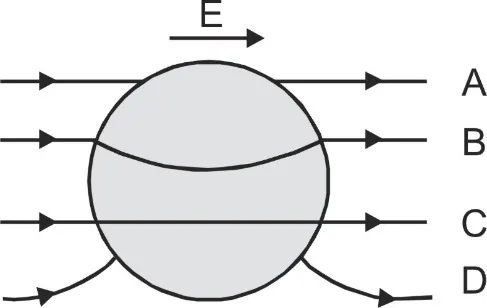 Q. A solid metallic sphere is placed in a uniform electric field. Which of the lines A, B, C and D shows the correct path and why?