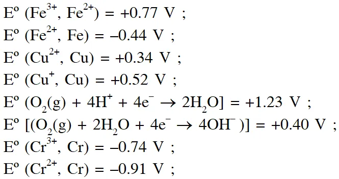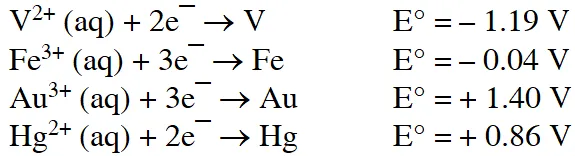 Q. For the reaction of $\mathrm{NO}_{3}^{-}$ ion in an aqueous solution, $\mathrm{E}^{\circ}$ is +0.96 V. Values of $\mathrm{E}^{\circ}$ for some metal ions are given below