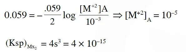 Q. The solubility product $\left(\mathrm{K}_{\mathrm{sp}} ; \mathrm{mol}^{3} \mathrm{dm}^{-9}\right)$ of $\mathrm{MX}_{2}$ at 298 K based on the information available for the given concentration cell is (take 2.303 × R × 298/F = 0.059 V)
