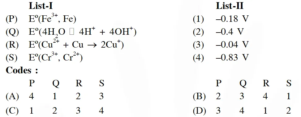 Match $\mathrm{E}^{\mathrm{o}}$ of the redox pair in List-I with the values given in List-II and select the correct answer using the code given below the lists :