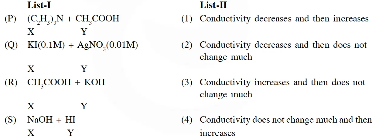 Q. An aqueous solution of X is added slowly to an aqueous solution of Y as shown in List-I. The variation in conductivity of these reactions is given in List-II. Match List-I with List-II and select the correct answer using the code given below the lists :