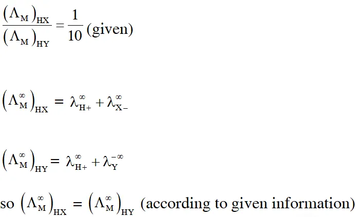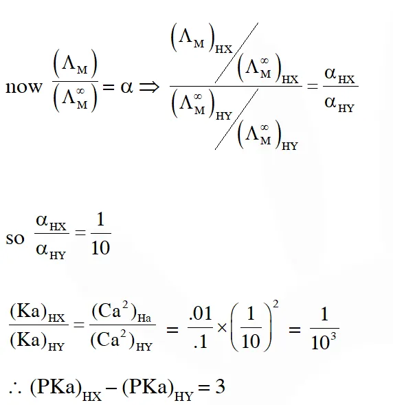 Q. The molar conductivity of a solution of a weak acid HX (0.01 M) is 10 times smaller than the molar conductivity of a solution of a weak acid HY (0.1 M). If $\lambda_{\mathrm{X}^{-}}^{0} \approx \lambda_{\mathrm{Y}^{-}}^{0}$ the difference in their $\mathrm{pK}_{\mathrm{a}}$ values $, \mathrm{pK}_{\mathrm{a}}(\mathrm{HX})-\mathrm{p} \mathrm{K}_{\mathrm{a}}(\mathrm{HY}),$ is (consider degree of ionization of both acids to be <<1).