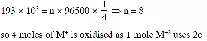 Q. All the energy released from the reaction X $\rightarrow \mathrm{Y}, \Delta_{\mathrm{r}} \mathrm{G}^{\circ}=-193 \mathrm{kJ} \mathrm{mol}^{-1}$ is used for the oxidizing $\mathrm{M}^{+}$ and $\mathrm{M}^{+} \rightarrow \mathrm{M}^{3+}+2 \mathrm{e}^{-}, \mathrm{E}^{\circ}=-0.25 \mathrm{V}$