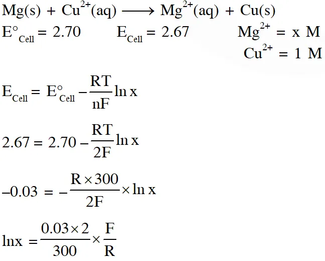 the standard emf of the cell is 2.70 V at 300 K. When the concentration of $\mathrm{Mg}^{2+}$ is changed to x M, the cell potential changes to 2.67 V at 300 K. The value of x is____.
