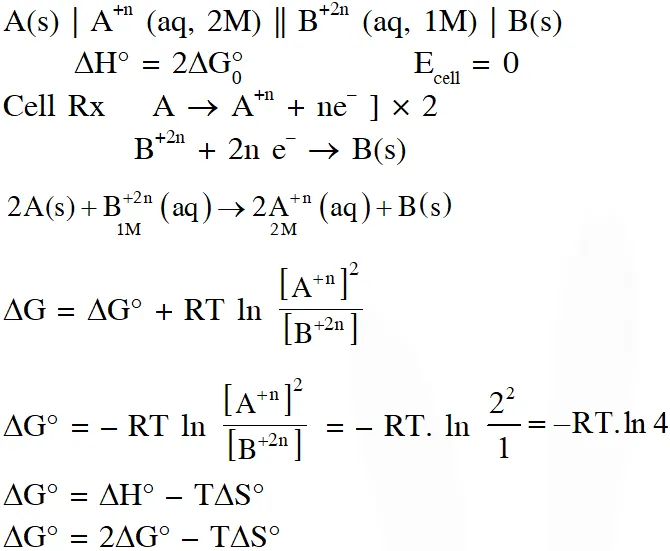 Q. Consider an electrochemical cell: $\mathrm{A}(\mathrm{s})\left|\mathrm{A}^{\mathrm{n}+}(\mathrm{aq}, 2 \mathrm{M}) \| \mathrm{B}^{2 \mathrm{n}+}(\mathrm{aq}, 1 \mathrm{M})\right| \mathrm{B}(\mathrm{s})$. The value of $\Delta \mathrm{H}^{\theta}$ for the cell reaction is twice that of $\Delta \mathrm{G}^{\theta}$ at 300 K. If the emf of the cell is zero, the $\Delta \mathrm{S}^{\theta}$ $\left(\text { in } \mathrm{JK}^{-1} \mathrm{mol}^{-1}\right)$ of the cell reaction per mole of B formed at 300 K is___.