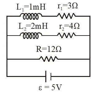 Q. Two inductors $\mathrm{L}_{1}$ (inductance 1 mH, internal resistance 3 $\Omega$) and L2 (inductance 2mH, internal resistance 4$\Omega$), and a resistor R (resistance 12 $\Omega$) are all connected in parallel across a 5V battery. The circuit is switched on at time t = 0. The ratio of the maximum to the minimum current $\left(I_{\max } / I_{\min }\right.$) drawn from the battery is ?