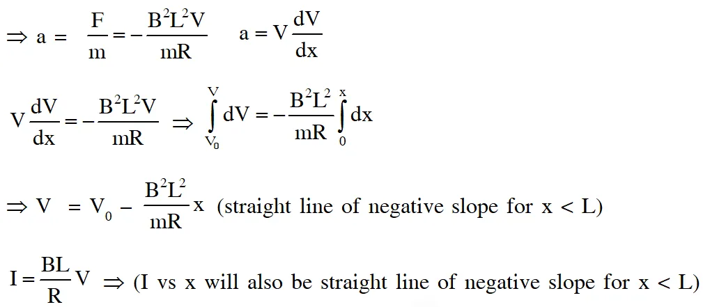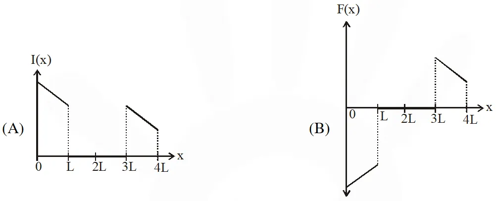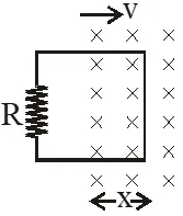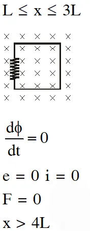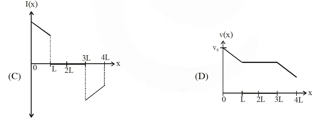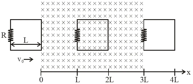 Q. A rigid wire loop of square shape having side of length L and resistance R is moving along the x-axis with a constant velocity $\mathrm{v}_{0}$ in the plane of the paper. At t = 0, the right edge of the loop enters a region of length 3L where there is a uniform magnetic field $B_{0}$ into the plane of the paper, as shown in the figure. For sufficiently large $\mathrm{V}_{\mathrm{o}}$, the loop eventually crosses the region. Let x be the location of the right edge of the loop. Let v(x), I(x) and F(x) represent the velocity of the loop, current in the loop, and force on the loop, respectively, as a function of x. Counter-clockwise current is taken as positive. Which of the following schematic plot(s) is(are) correct ? (Ignore gravity)