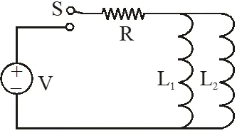 $\mathrm{I}_{1}=\frac{\mathrm{V}}{\mathrm{R}} \frac{\mathrm{L}_{2}}{\mathrm{L}_{1}+\mathrm{L}_{2}}, \quad \mathrm{I}_{2}=\frac{\mathrm{V}}{\mathrm{R}} \frac{\mathrm{L}_{1}}{\mathrm{L}_{1}+\mathrm{L}_{2}}$