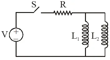 $\left.\mathrm{I}=\mathrm{V} / \mathrm{R}_{(1-\mathrm{e}}^{-\frac{\mathrm{RT}}{\mathrm{L}}}\right)$ where $\mathrm{L}=\frac{\mathrm{L}_{1} \mathrm{L}_{2}}{\mathrm{L}_{1}+\mathrm{L}_{2}}$
