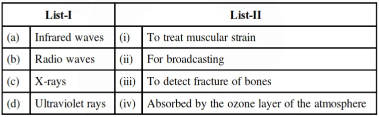 Q. Match List-I (Electromagnetic wave type) with List-II (Its association/application) and select the correct option from the choices given below the lists: