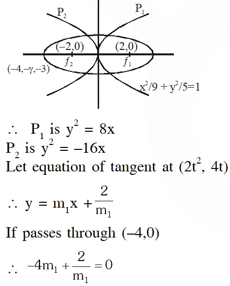Q. Suppose that the foci of the ellipse $\frac{x^{2}}{9}+\frac{y^{2}}{5}=1$ are $\left(f_{1}, 0\right)$ and $\left(f_{2}, 0\right)$ where $f_{1}>0$ and $f_{2}<0 .$ Let $\mathrm{P}_{1}$ and $\mathrm{P}_{2}$ be two parabolas with a common vertex at $(0,0)$ and with foci at $\left(f_{1}, 0\right)$ and $\left(2 f_{2}, 0\right),$ respectively. Let $\mathrm{T}_{1}$ be a tangent to $\mathrm{P}_{1}$ which passes through $\left(2 f_{2}, 0\right)$ and $\mathrm{T}_{2}$ be a tangent to $\mathrm{P}_{2}$ which passes through $\left(f_{1}, 0\right) .$ If $\mathrm{m}_{1}$ is the slope of $\mathrm{T}_{1}$ and $\mathrm{m}_{2}$ is the slope of $\mathrm{T}_{2},$ then the value of