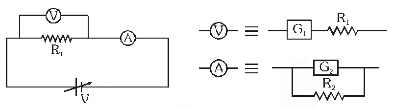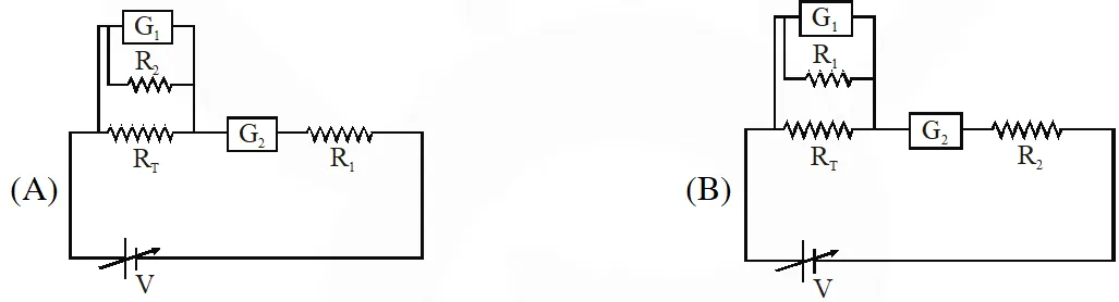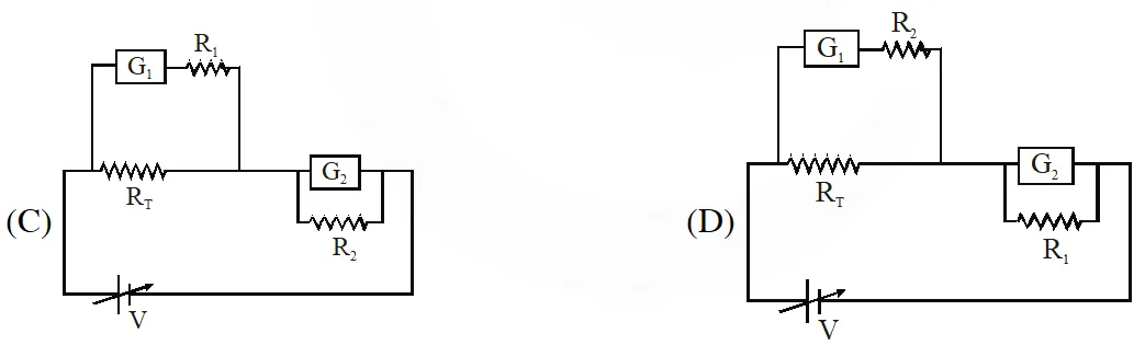 Q. To verify Ohm’s law, a student is provided with a test resistor $\mathrm{R}_{\mathrm{T}}$, a high resistance $\mathrm{R}_{1}$, a small resistance $\mathrm{R}_{2}$, two identical galvanometers $\mathrm{G}_{1}$ and $\mathrm{G}_{2}$ , and a variable voltage source V. The correct circuit to carry out the experiment is :–
