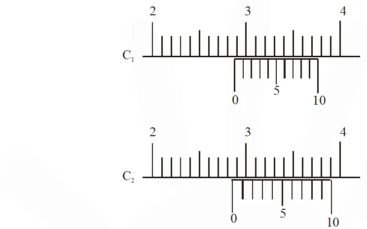 Q. There are two vernier calipers both of which have $1 \mathrm{cm}$ divided into 10 equal divisions on the main scale. The Vernier scale of the calipers $\left(\mathrm{C}_{1}\right)$ has $10 \mathrm{equal}$ divisions that correspond to 9 main scale divisions. The Vernier scale of the other caliper $\left(\mathrm{C}_{2}\right)$ has 10 equal divisions that correspond to 11 main scale divisions. The readings of the two calipers are shown in the figure. The measured values (in $\mathrm{cm}$ ) by calipers $\mathrm{C}_{1}$ and $\mathrm{C}_{2}$ respectively, are :